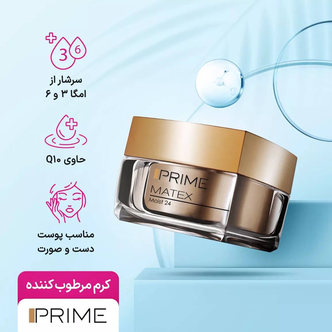کرم مرطوب کننده 24 ساعته پریم با ترکیبات، ویتامین ها و مواد معدنی غنی، رطوبت پوست را تا 24 ساعت تامین و مانع چروک و پیر شدن پوست می شود